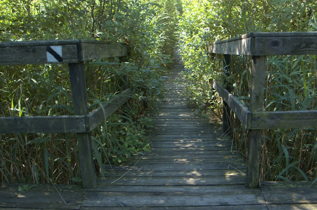 Kolejna atrakcją są wydmy. Nad Bałtykiem już widziałem, teraz czas na bagna. Ścieżka typowo piesza – o czym świadczą znaki, jak i jej szerokość. Rower musiałem czasami nieść między pokrzywami.